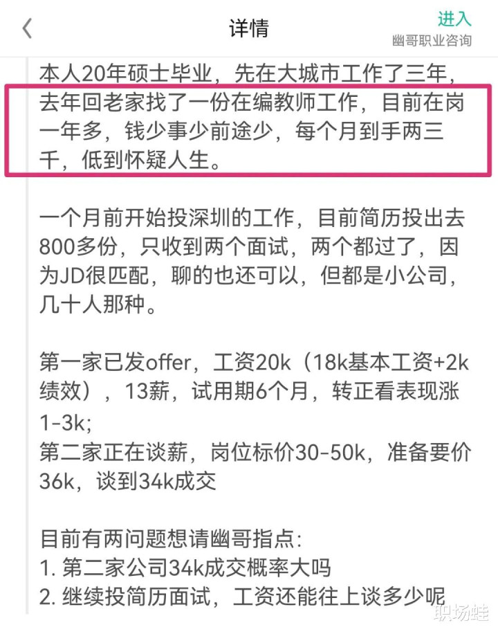 比如上图这位星友,他在湖北老家荆州工资就“低到怀疑人生”,所以他毅然抛弃这个事业编,目前已经找到第一个Offer大致月薪2万。他实际是上是来问第二家如何确保谈到3万4且不黄掉,并且问第三家该如何谈到更高的工资。